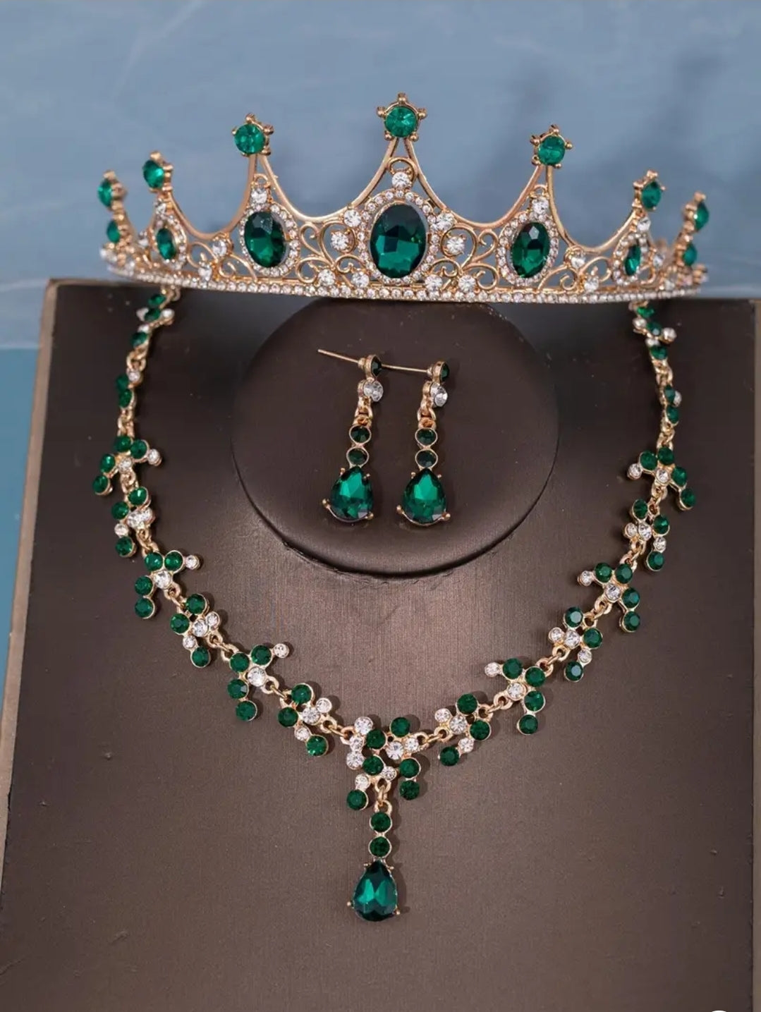 Conjunto dorado en aleación de zinc con diamantes de cristal verde esmeralda.