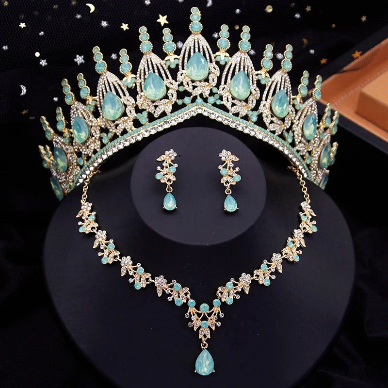 Conjunto dorado en aleación de zinc con diamantes de cristal verde menta.