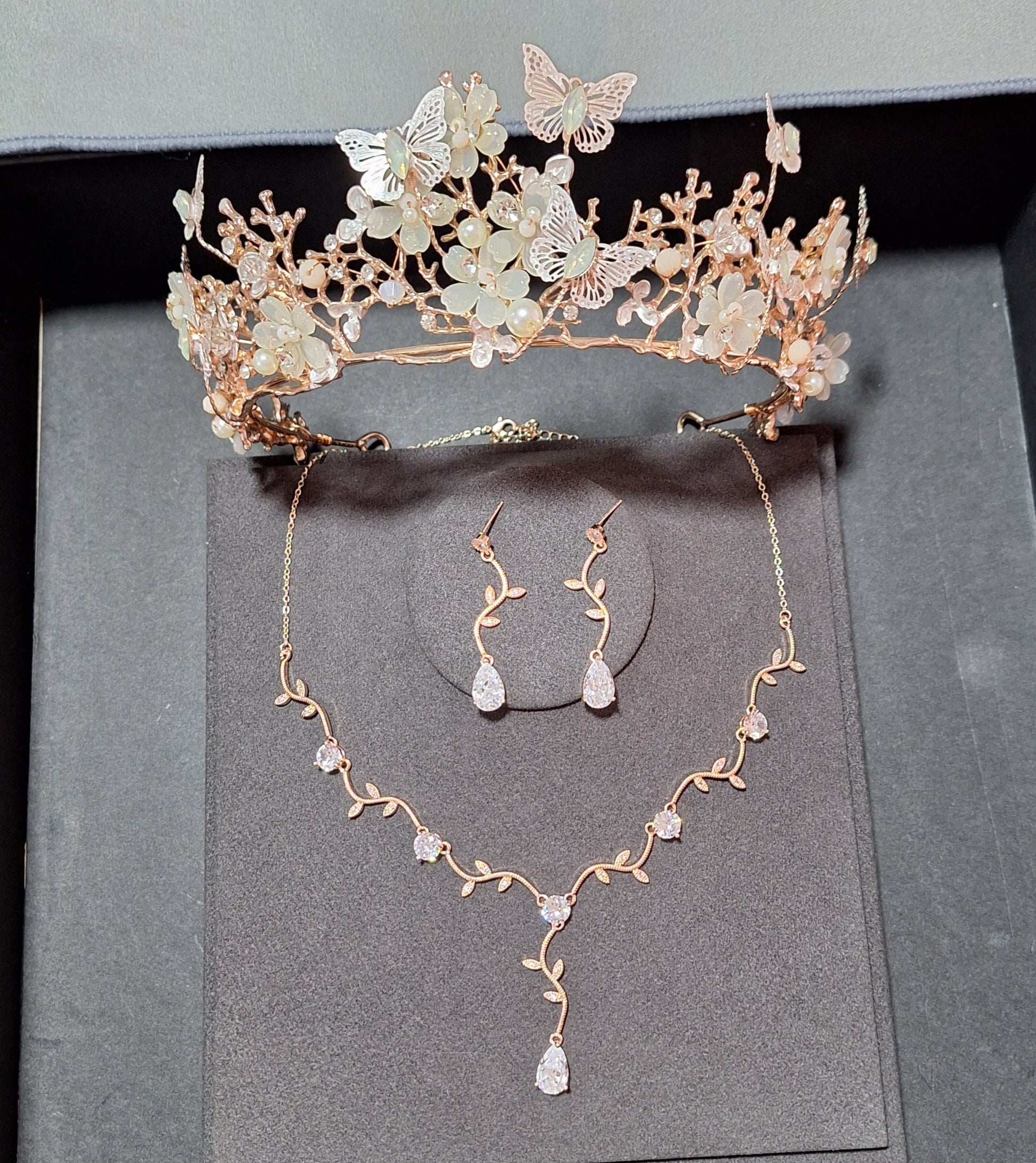 Conjunto en aleación de zinc con diamantes de cristal oro rosa.