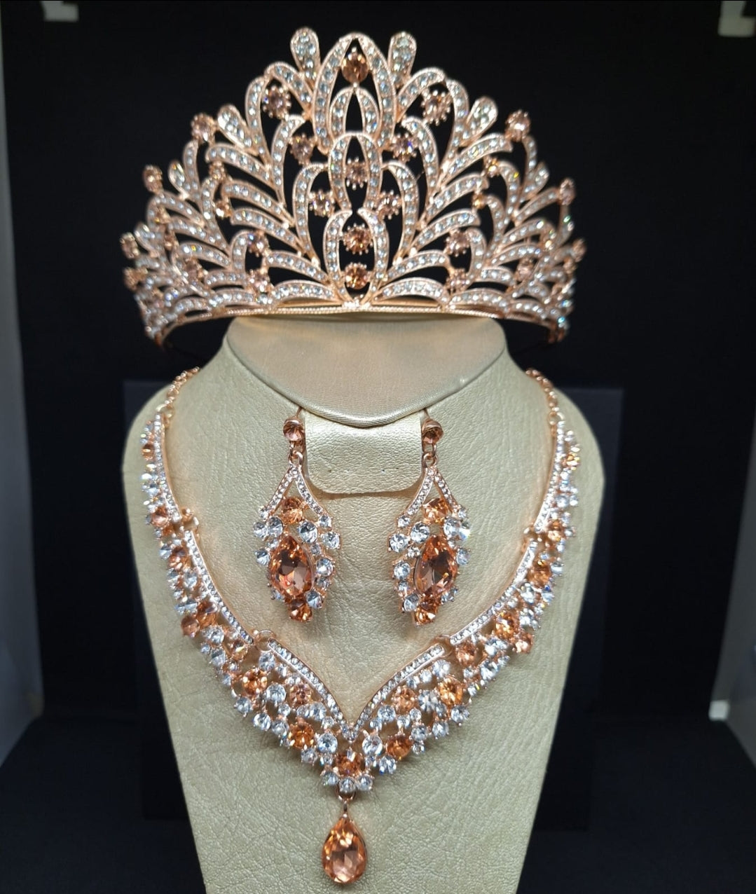 Conjunto oro rosa en aleación de zinc con diamantes de cristal.