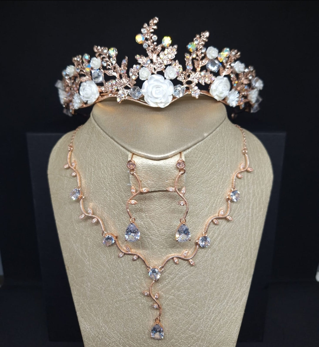 Conjunto oro rosa en aleación de zinc con diamantes de cristal.