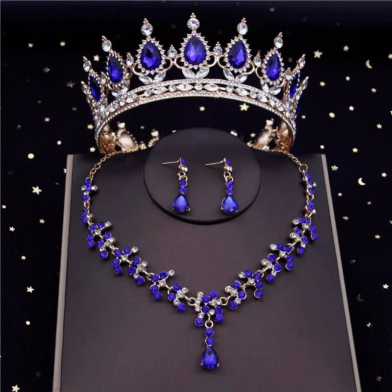 Conjunto dorado en aleación de zinc con diamantes de cristal azul marino.