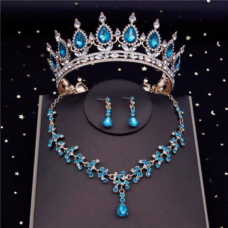 Conjunto dorado en aleación de zinc con diamantes de cristal azul cielo.