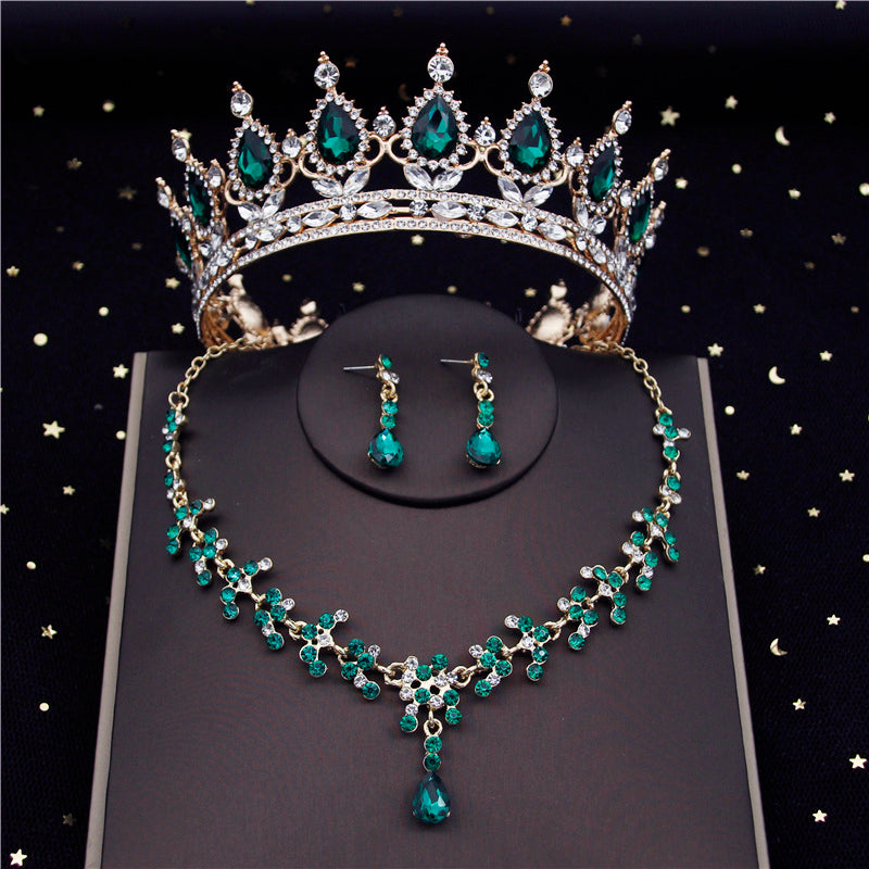 Conjunto dorado en aleación de zinc con diamantes de cristal verdes.