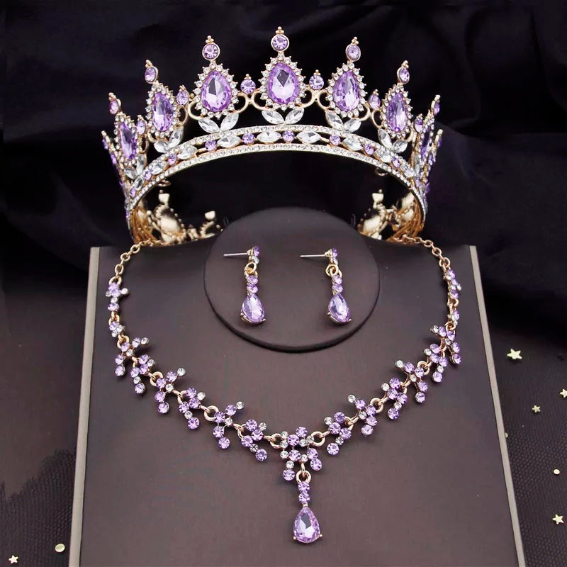 Conjunto dorado en aleación de zinc con diamantes de cristal lila.