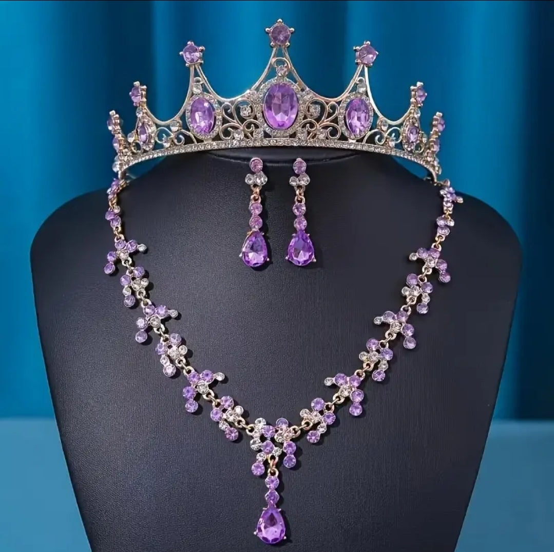 Conjunto dorado en aleación de zinc con diamantes de cristal lila.
