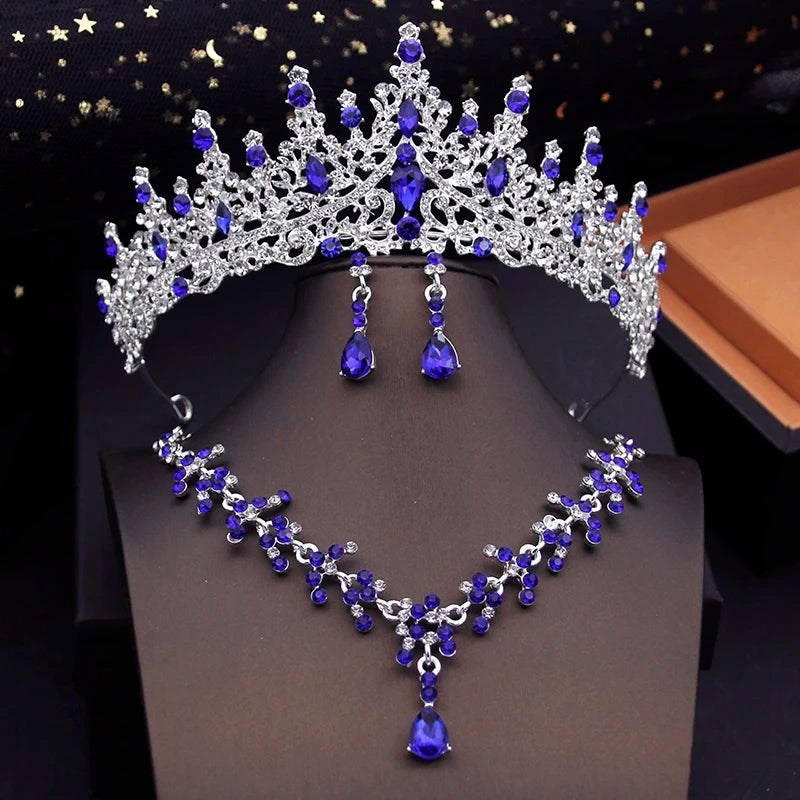 Joyería plateada en aleación de zinc con diamantes de cristal azul marino.