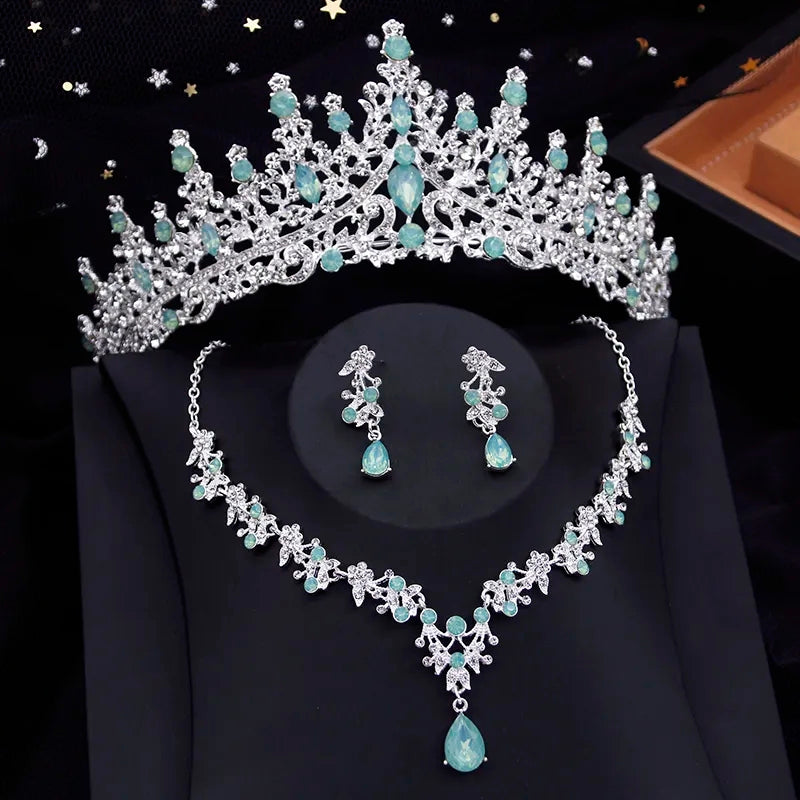 Joyería plateada en aleación de zinc con diamantes de cristal verde menta.