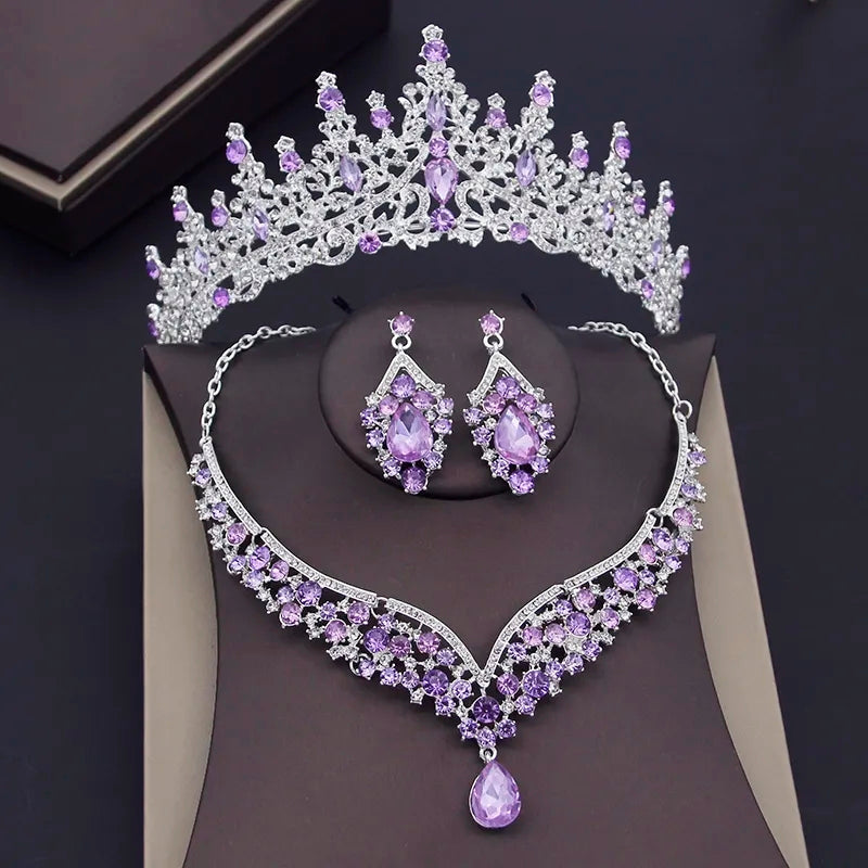 Conjunto plateado en aleación de zinc con diamantes de cristal purpura.