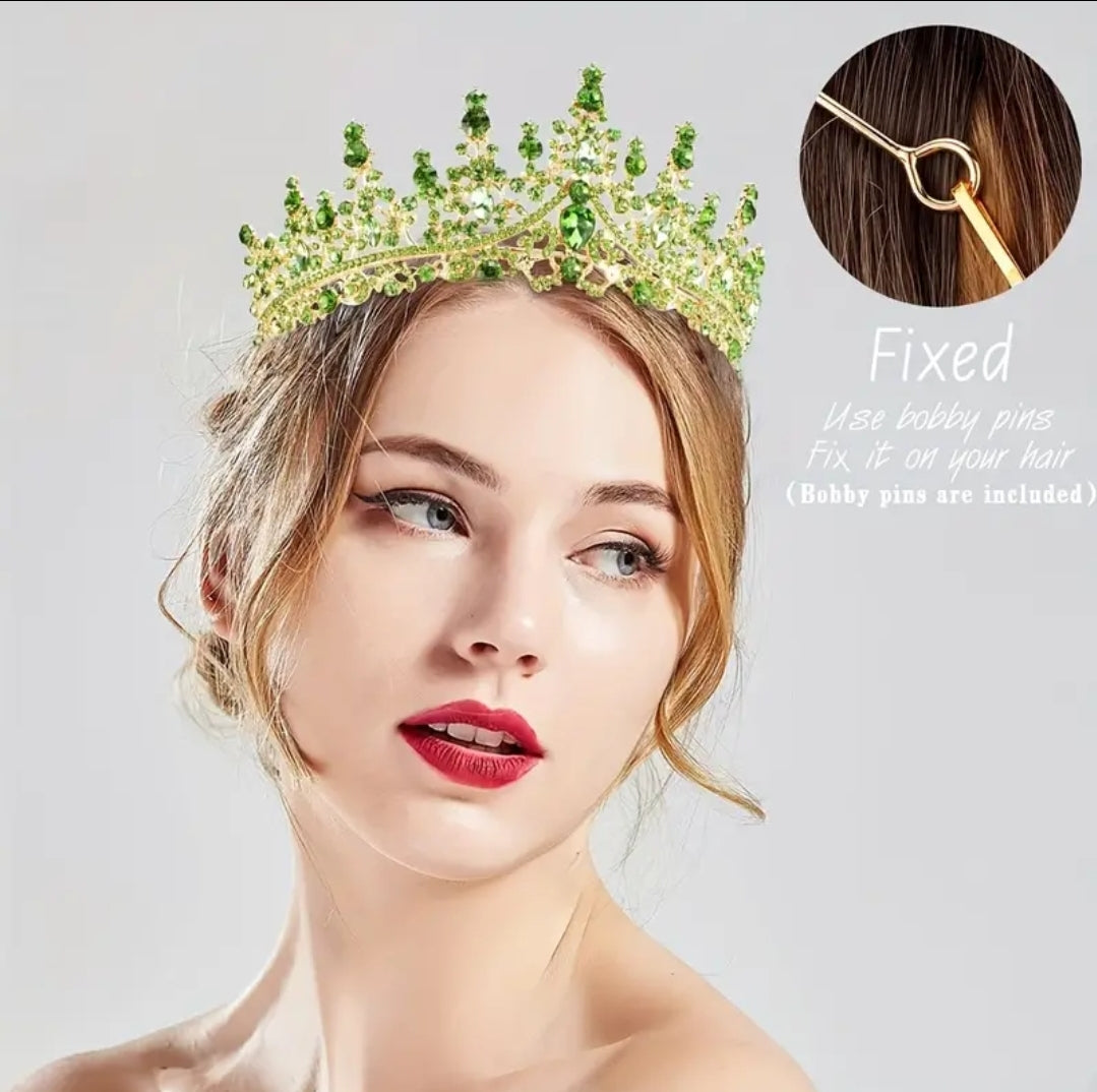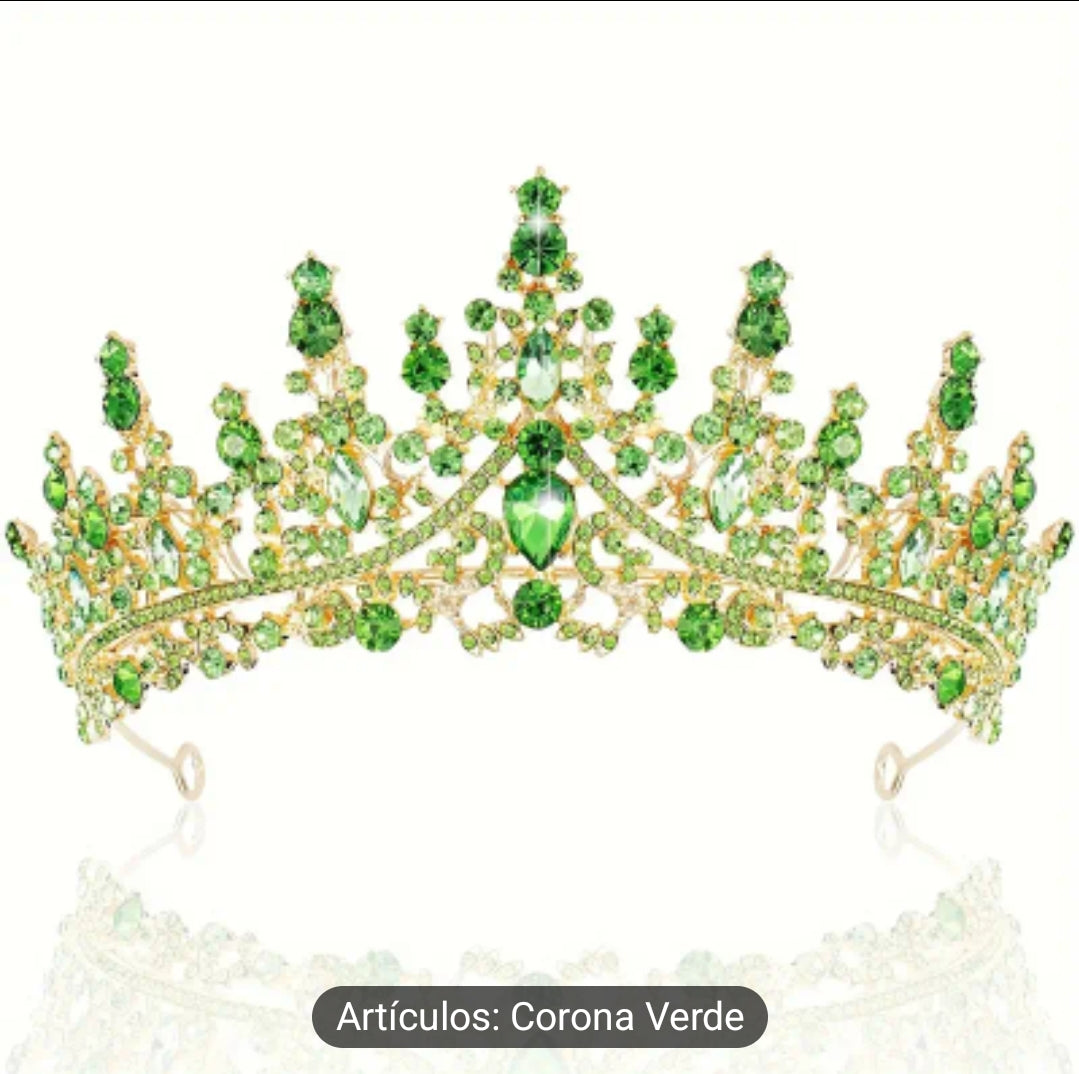 Tiara verde en aleación de zinc con diamantes de cristal.