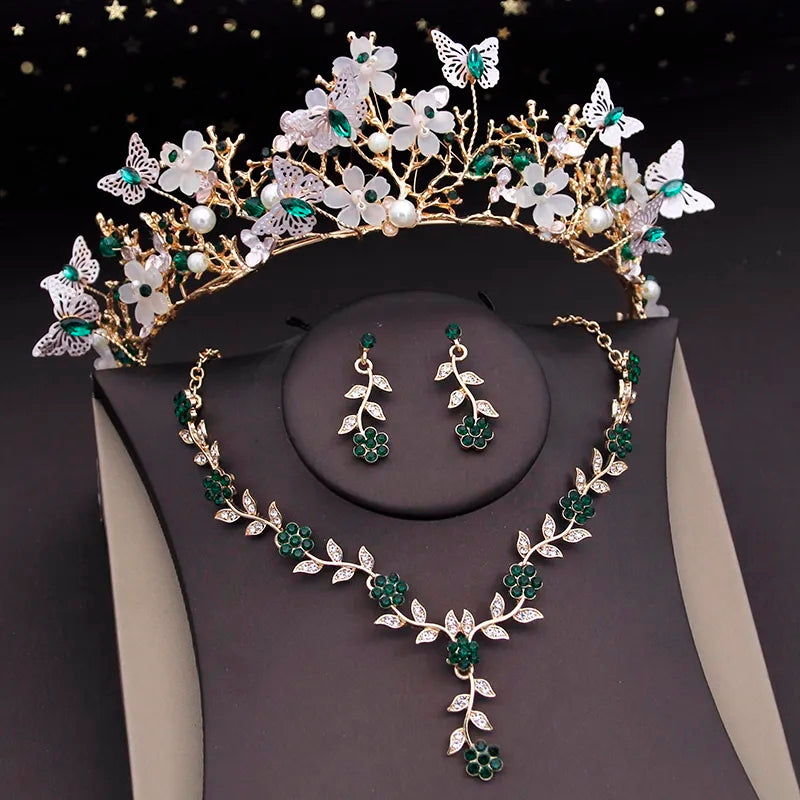 Conjunto dorado en aleación de zinc con diamantes de cristal rojos.
