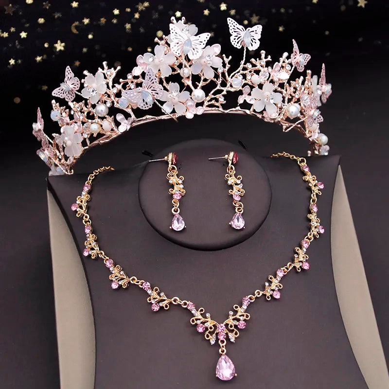 Conjunto dorado en aleación de zinc con diamantes de cristal rosa.