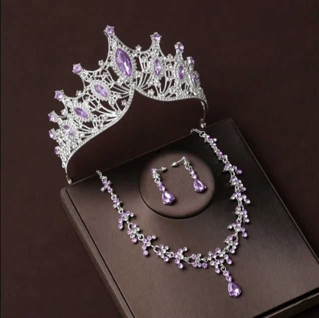 Conjunto plateado en aleación de zinc con diamantes de cristal purpura.