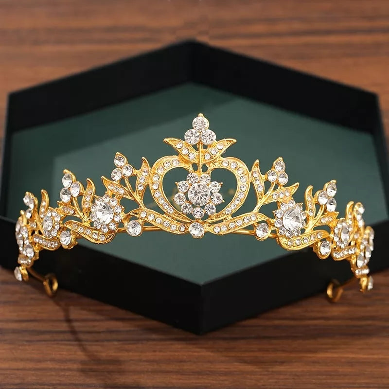 Esta elegante tiara combina un diseño sofisticado con un acabado dorado que realza su aspecto majestuoso. Adornada con cristales brillantes en patrones florales y un centro con forma de corazón, simboliza elegancia y romance. Perfecta para novias o quinceañeras que buscan destacar con un toque de lujo en su día especial. Su estructura ligera y ajustable garantiza comodidad durante todo el evento. Ideal para complementar peinados recogidos o semi-recogidos, añadiendo un brillo inigualable a tu look.
