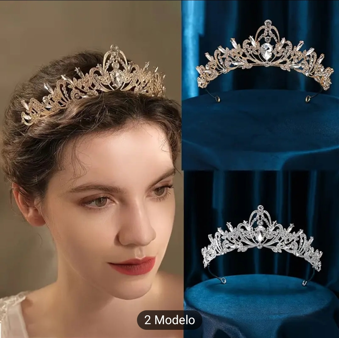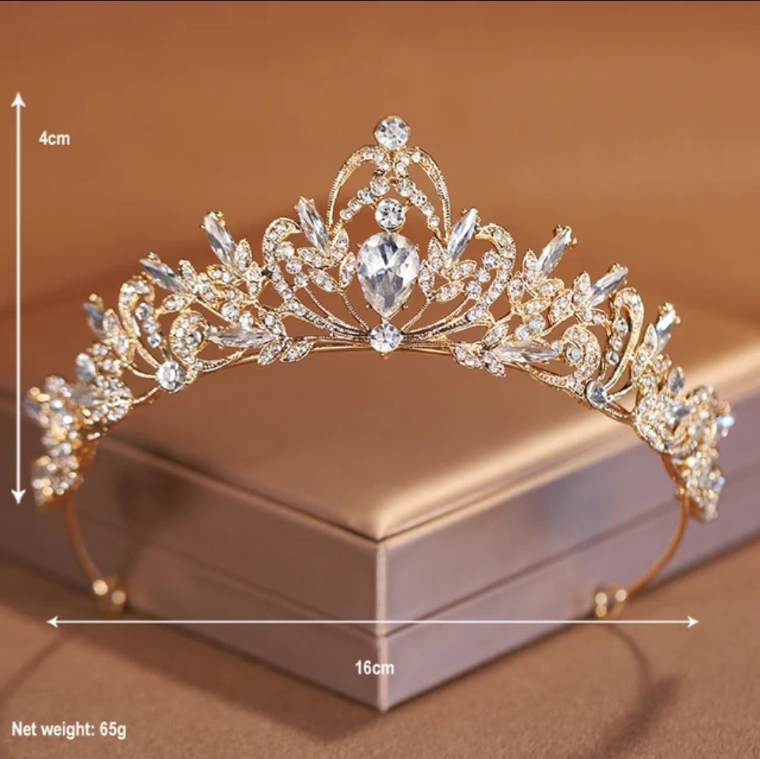Tiara dorada en aleación de zinc con diamantes de cristal.